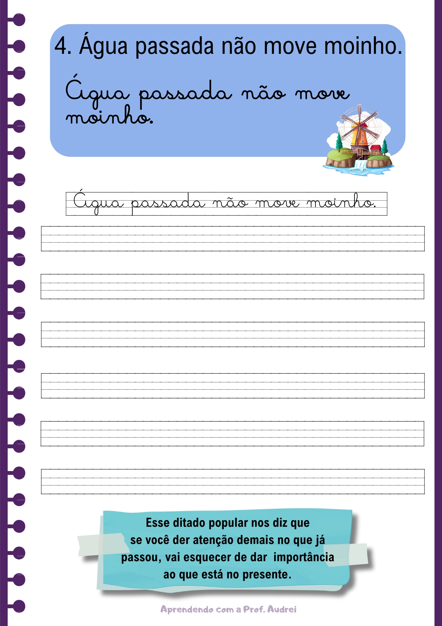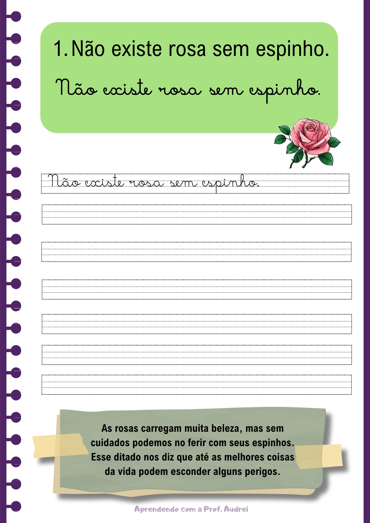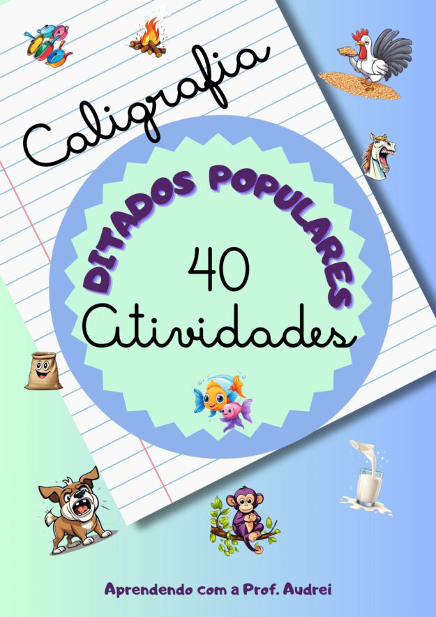 Os exercícios utilizam ditados populares, que além de divertidos, ampliam o repertório linguístico e cultural dos estudantes. Assim, a criança pratica a escrita de forma leve, contextualizada e envolvente, enquanto desenvolve habilidades essenciais para o processo de alfabetização.