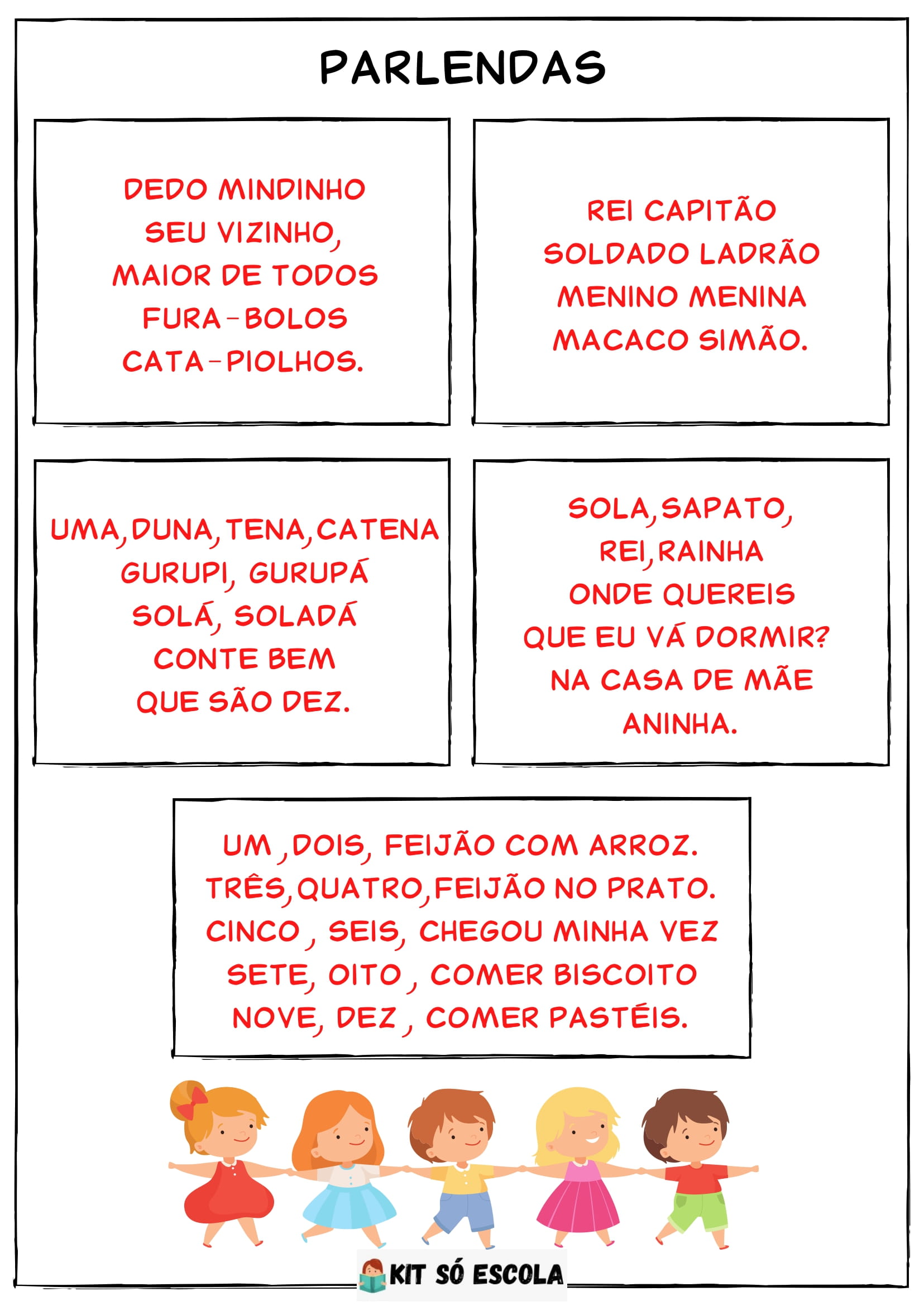 Parlendas, trava-línguas e frases com expressões populares, resgatando a tradição oral;