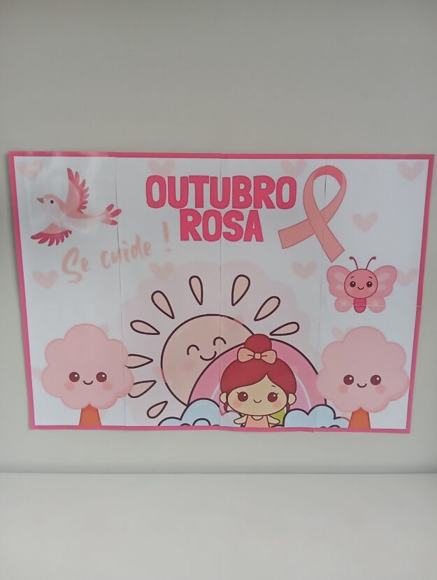 O painel é fofo, educativo e cheio de significado, pensado para reforçar a importância do autocuidado, da prevenção e da conscientização sobre o câncer de mama.