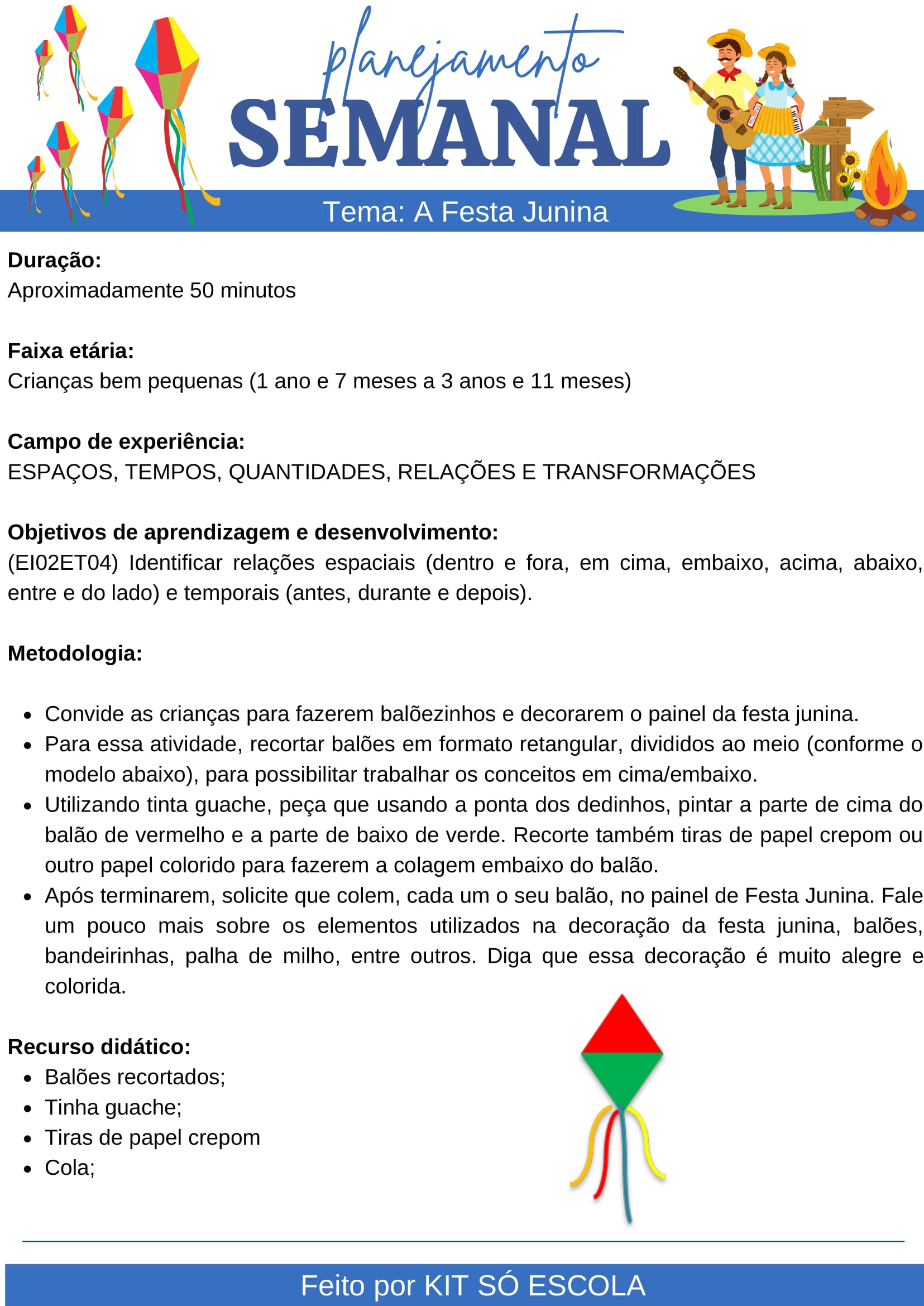 Prepare suas aulas de Festa Junina de forma prática e educativa com este material completo para crianças de 1 ano e 7 meses a 3 anos e 11 meses. O pacote traz planejamentos semanais detalhados, facilitando a organização das atividades e garantindo experiências significativas para os pequenos.