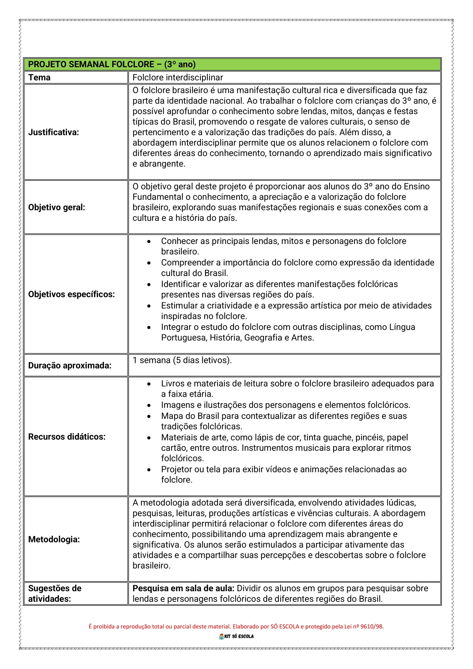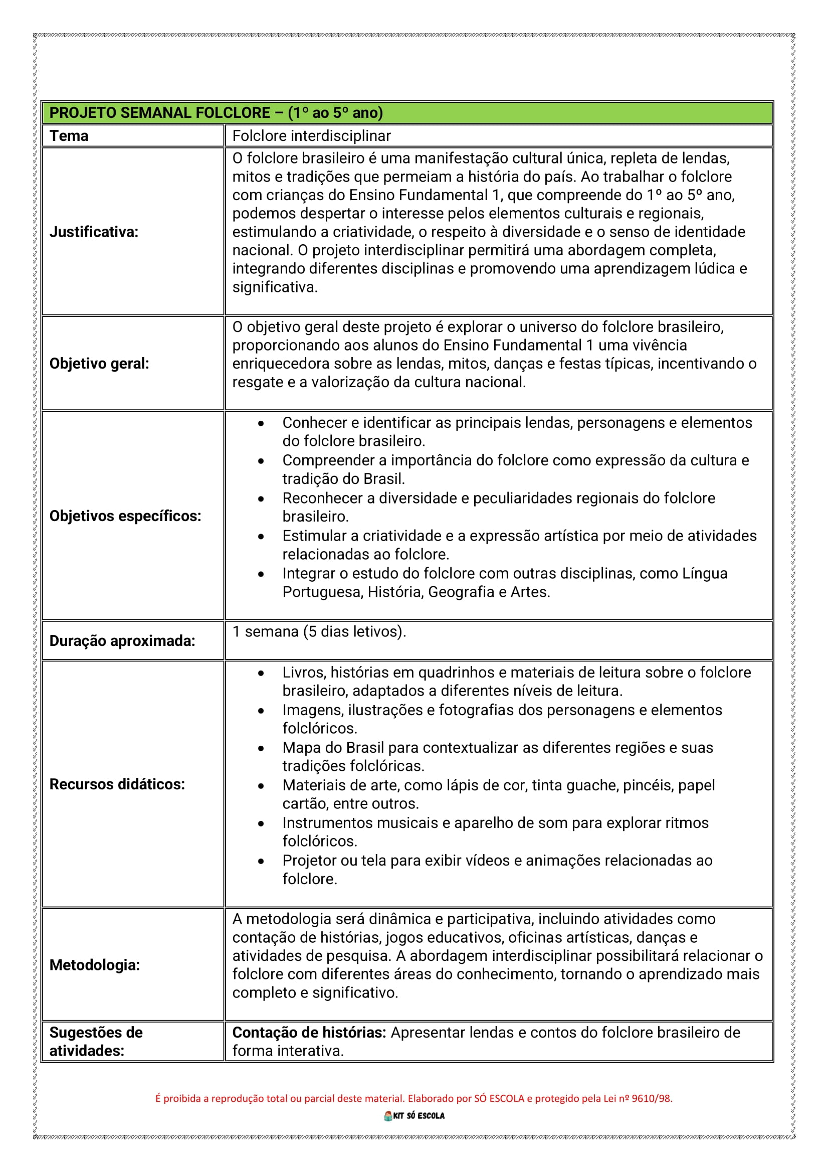 📘 Kit de Projetos Semanais de Folclore – Ensino Fundamental 1